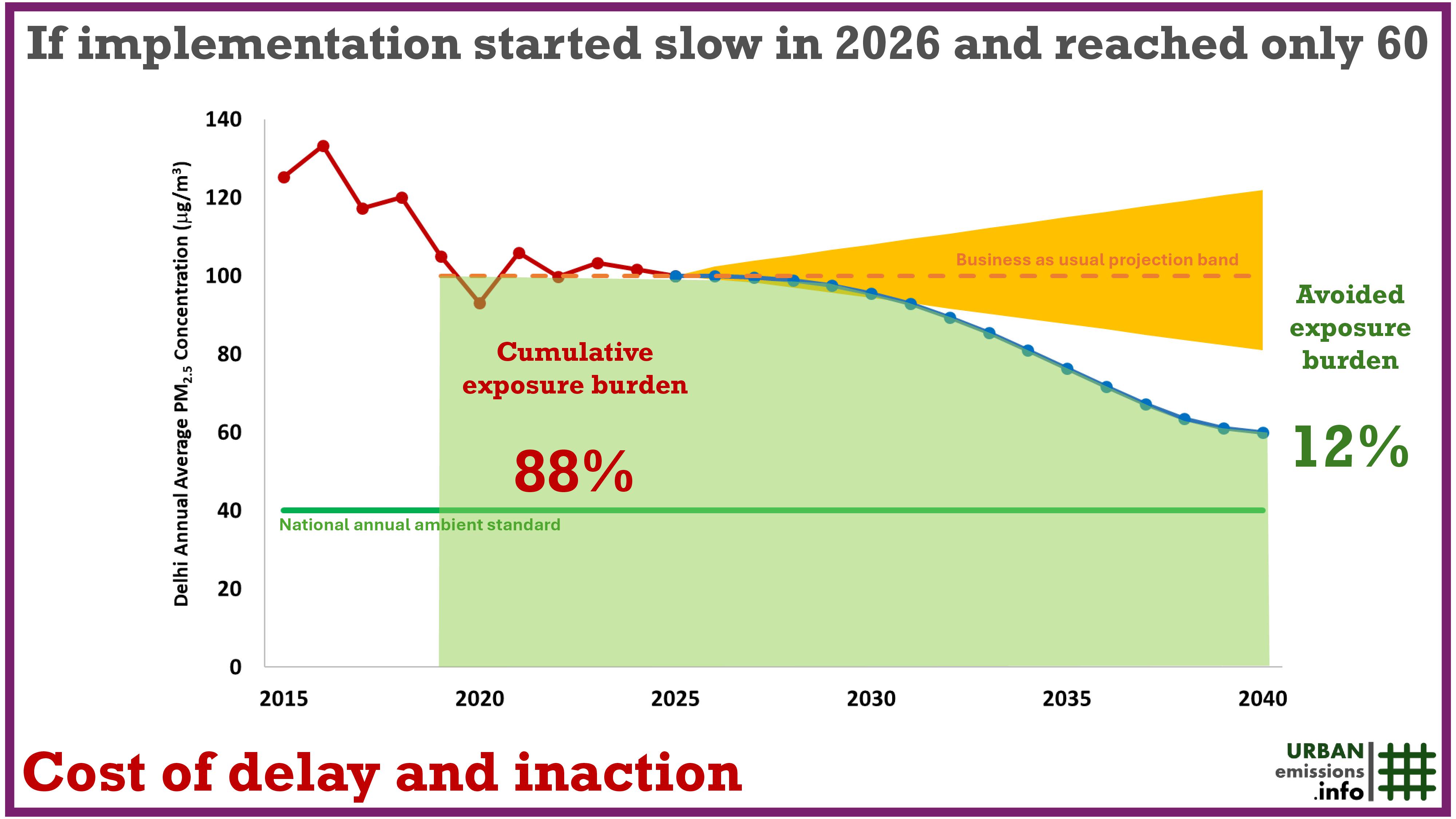 A hypothetical assessment of how Delhi’s annual averages can be 40 ug/m3 by 2040 and what is the cost of inaction and delays. Download the scenario calculator here and a power point file here.